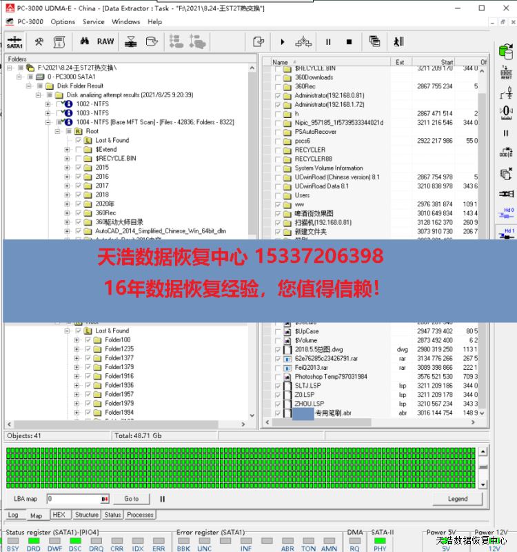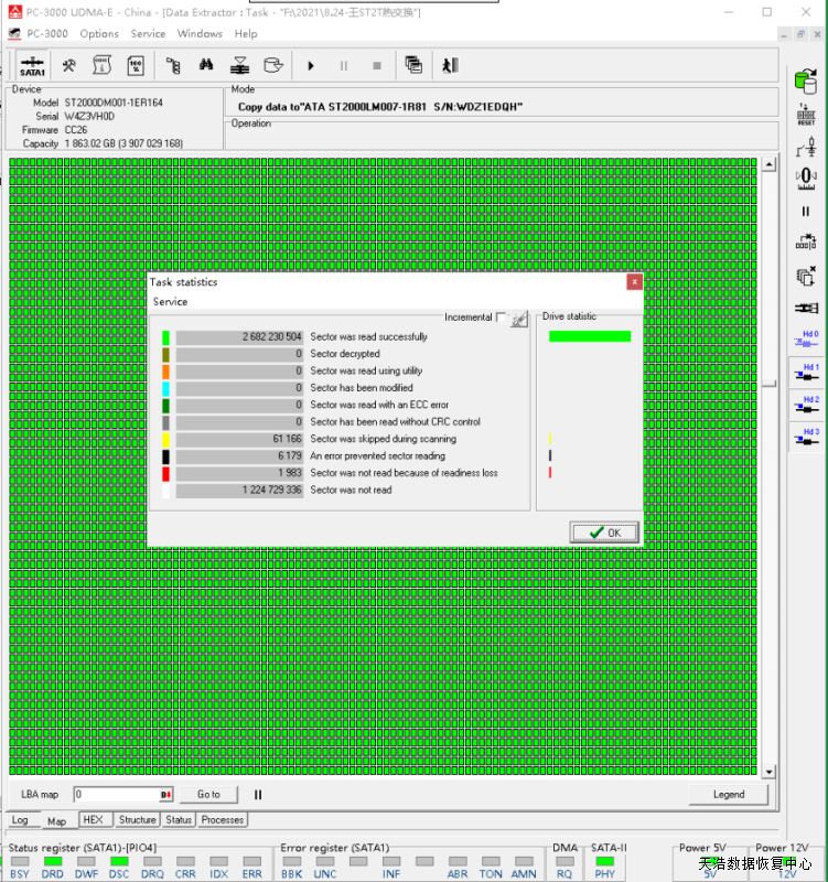 解決方案:收到硬盤后,接到專業數據恢復工具PC-3000 UDMA Express上,我們使用希捷F3新盤熱交換技術,讀出硬盤原始關鍵固件,再熱交換鏡像,成功恢復客戶硬盤內大部分數據!