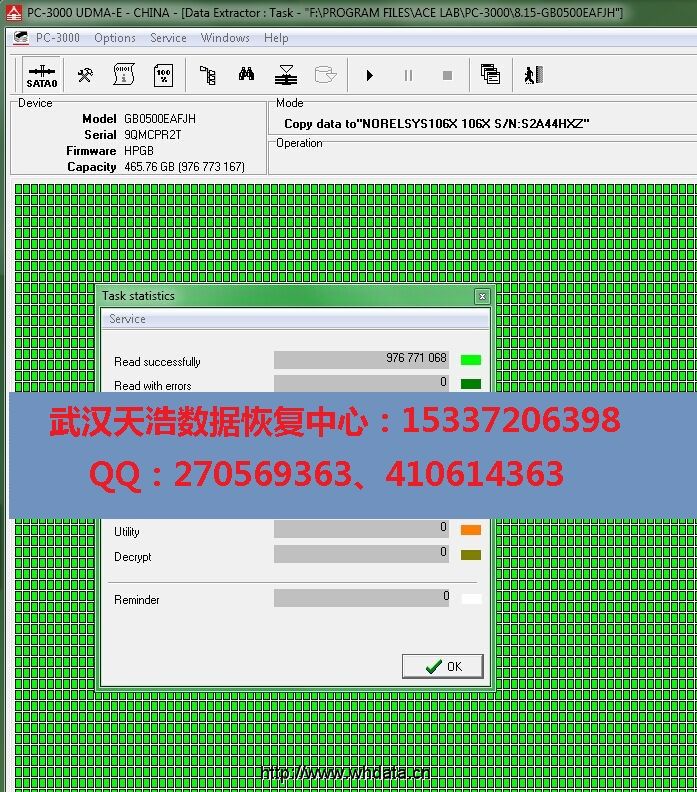 解決方案:收到硬盤后,接到數據恢復工具PC-3000 UDMA Express上,通電檢測發現是硬盤固件損壞,通過固件處理,最后硬盤認盤,鏡像,客戶需要的數據庫文件全部完整恢復!