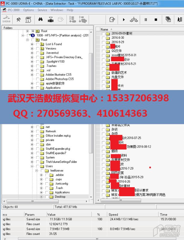 解決方案:收到硬盤后,接到數據恢復工具PC-3000 UDMA Express DE上,也不能正常展開分區,HFS分區,全盤鏡像后,經分析,是分區結構部分有些關鍵的地方損壞,手工分析改動后,再用UDMA的分區分析后,分區正常展開,最后,成功恢復客戶的幾乎全部數據!
